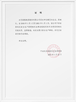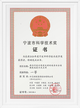 寧波市科學技術獎證書-面向污廢水深度處理的超親水分離膜集成技術及應用(水藝控股集團)
