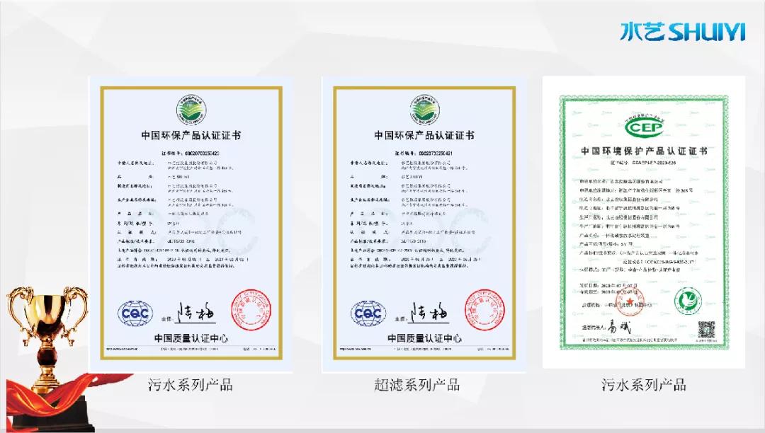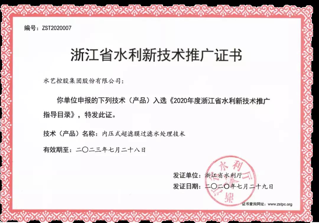 2020年,“Slufri-MBR一體化高效生物反應器”與“中空纖維膜超濾凈水設備”系列產品通過中國質量認證中心(CQC)“中國環保產品認證”。與此同時,“Slufri-MBR一體化高效生物反應器”通過了中國環境保護產業協會(CCAEPI)"中國環境保護產品認證”。七月,水藝內壓式超濾膜過濾水處理技術入選《2020年度浙江省水利新技術推廣指導目錄》。