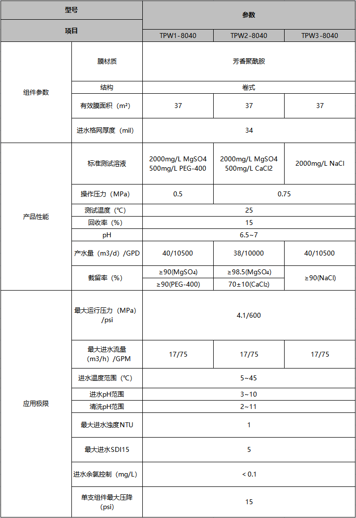 TPW1系列:TPW1主要針對水中有機物的脫除,保留大部分一價離子,適用于低鹽濃度水源。
